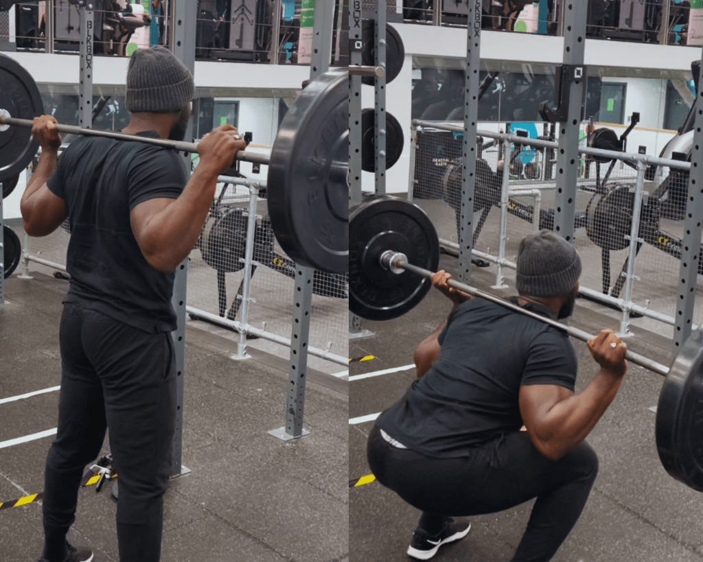 First up here we have the back squat. The key thing here is to keep your chest up and push through you heels. Keep your feet shoulder width apart and make sure your knees don’t go past your toes when squatting.